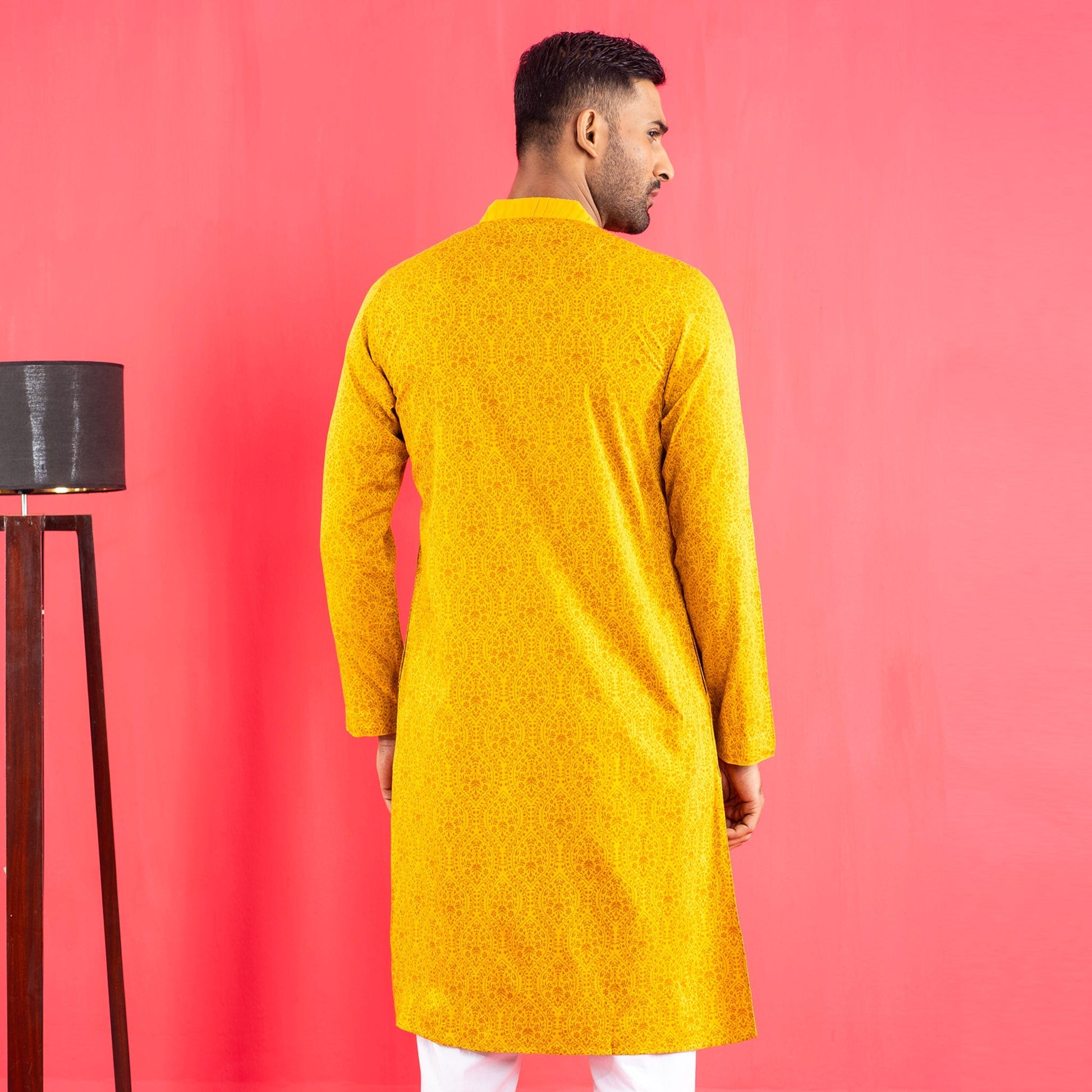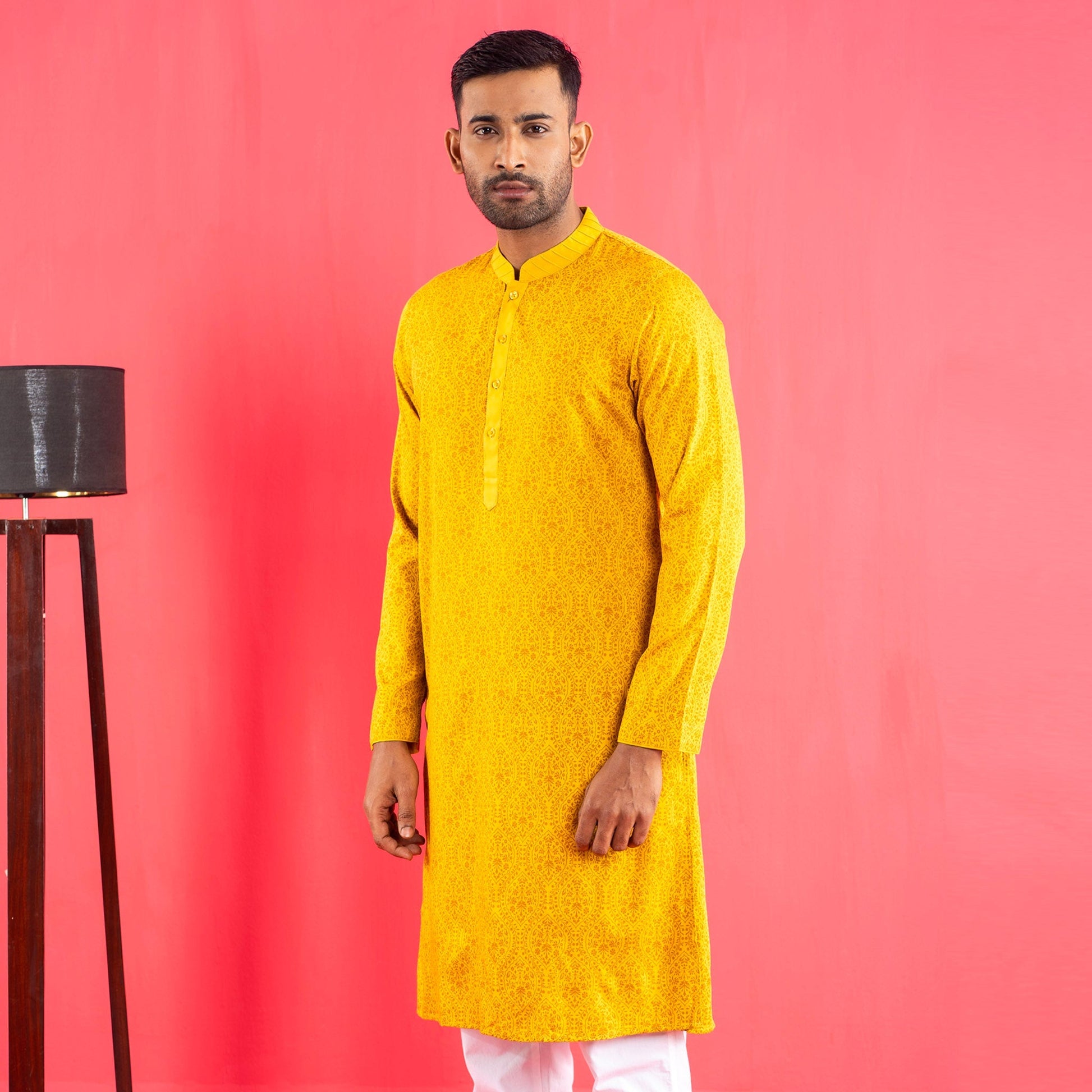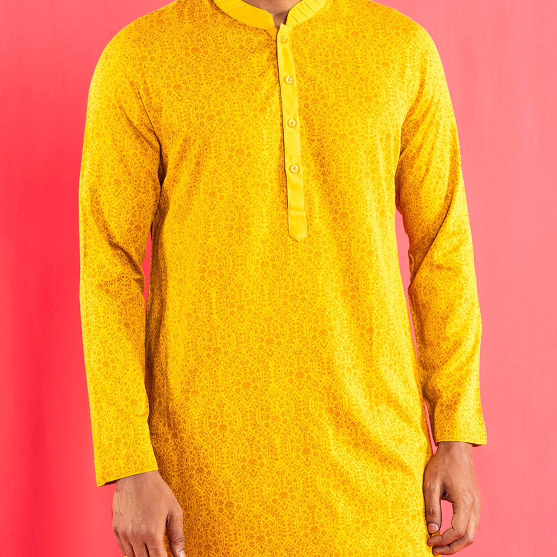 Enhance your traditional wardrobe with this men's beige Panjabi. Featuring a printed design with a pleated collar and placket, and metal buttons, it is crafted from a poly-cotton blend for a comfortable regular fit. Perfect for cultural events and festive occasions, this panjabi offers a stylish and sophisticated look.