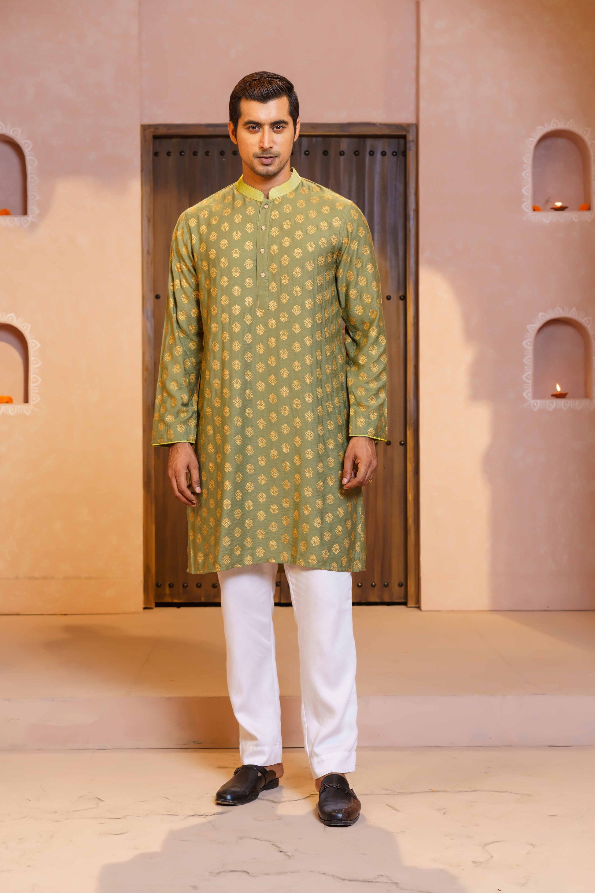 Stay stylish and comfortable with this Mens Basic Panjabi. Features like a gold metallic print and contrast collar make this piece a great addition to your wardrobe. Enjoy the Pistachio Green color and the ease of the comfortable fit.