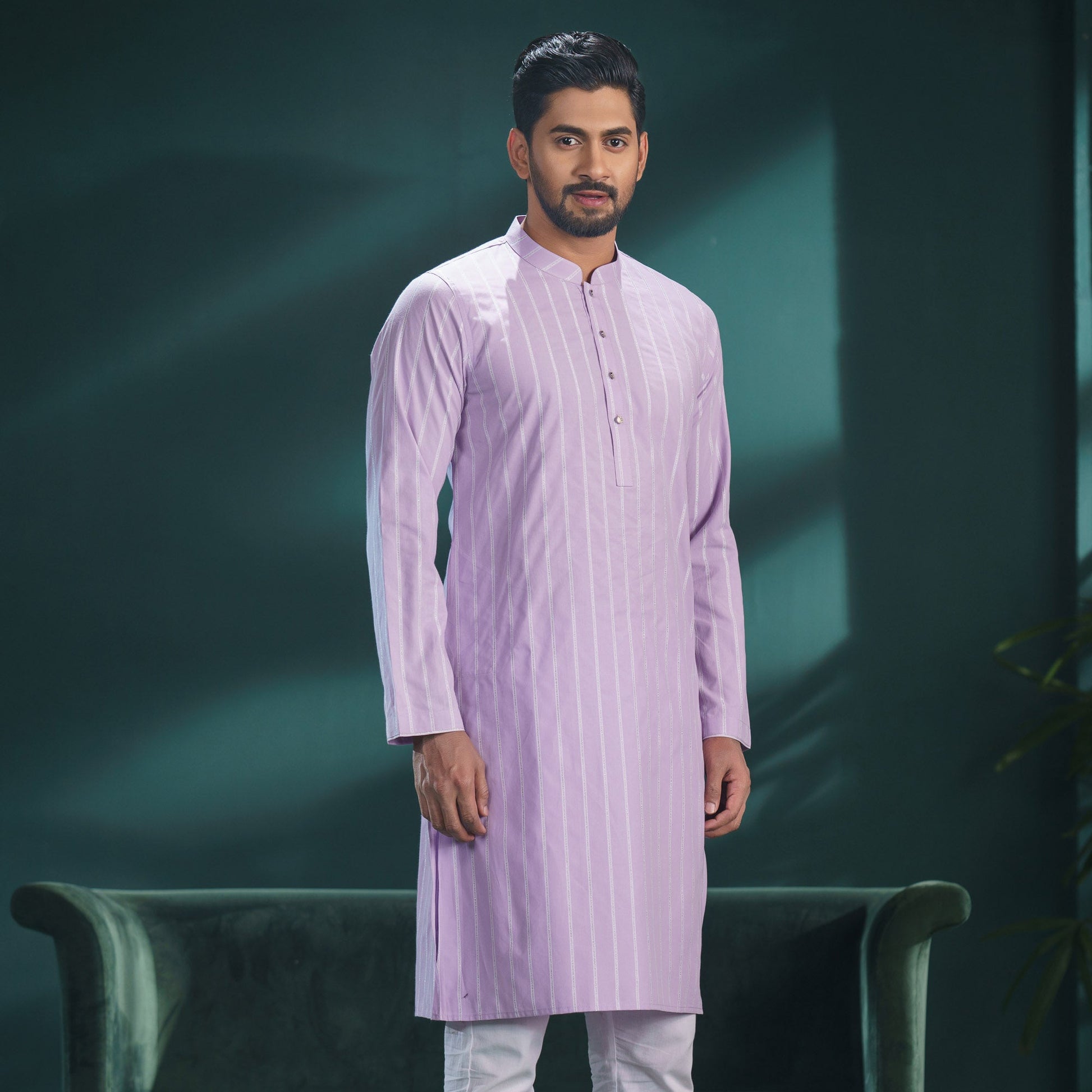 This men's lavender Panjabi is crafted from soft cotton and features a minimalist design with metal shank buttons for a sleek, modern touch. The regular fit ensures comfort, while the mandarin collar adds a classic element, making it suitable for both casual wear and special occasions. A refined choice for men who appreciate subtle elegance in their ethnic attire.