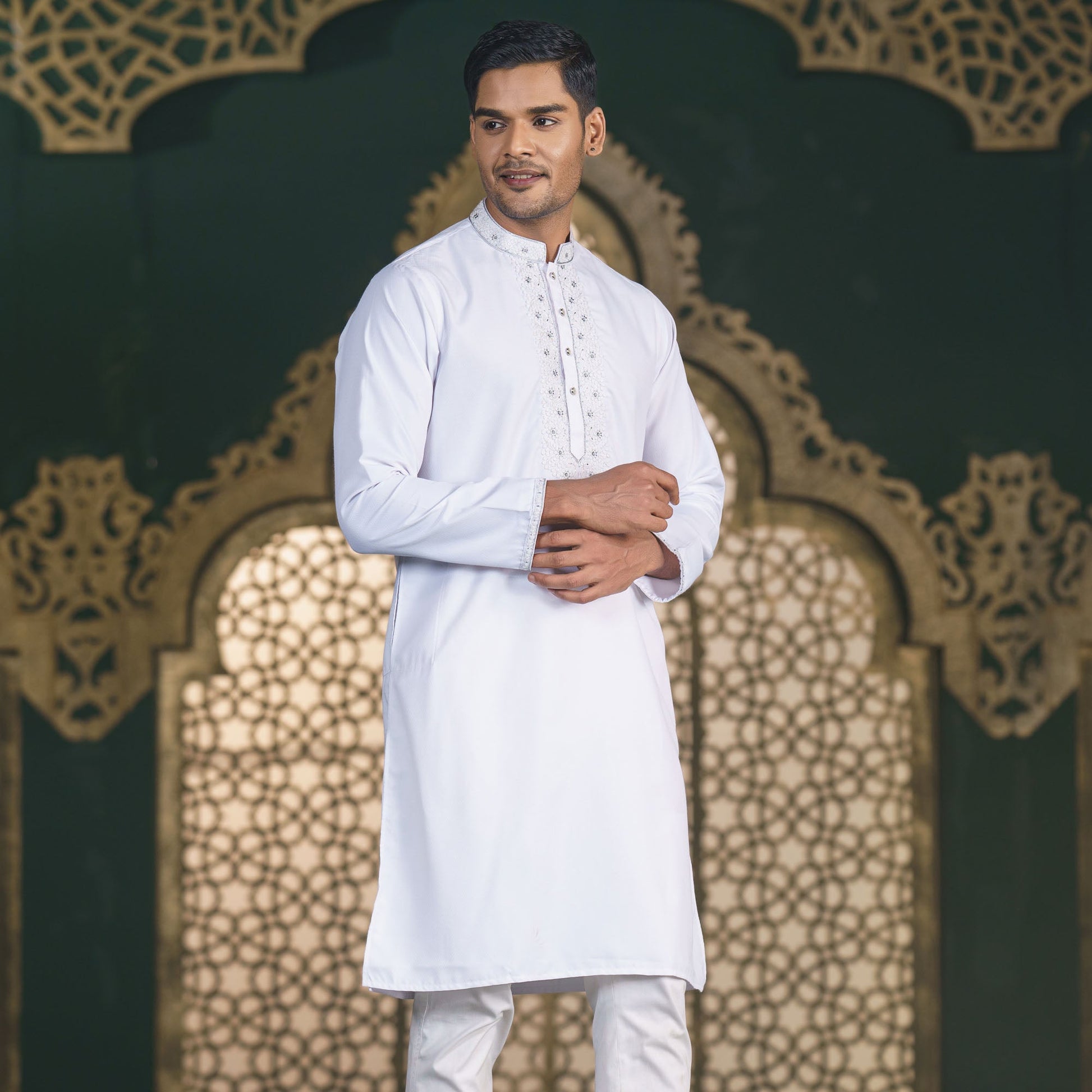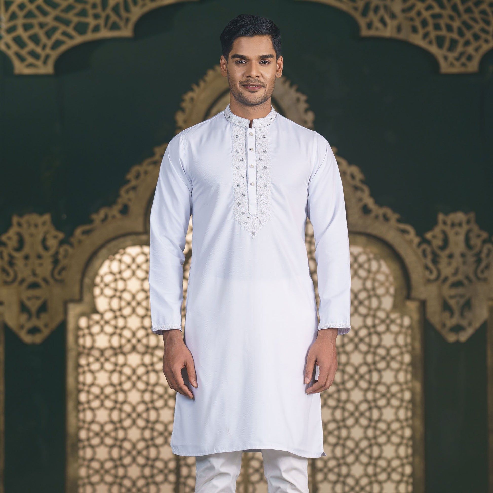 This men's white Panjabi is crafted from soft cotton fabric and features intricate embroidery with a mandarin collar. The regular fit ensures comfort and a sophisticated appearance, making it ideal for both casual gatherings and festive occasions. A versatile choice for men who appreciate timeless elegance in their ethnic wear.