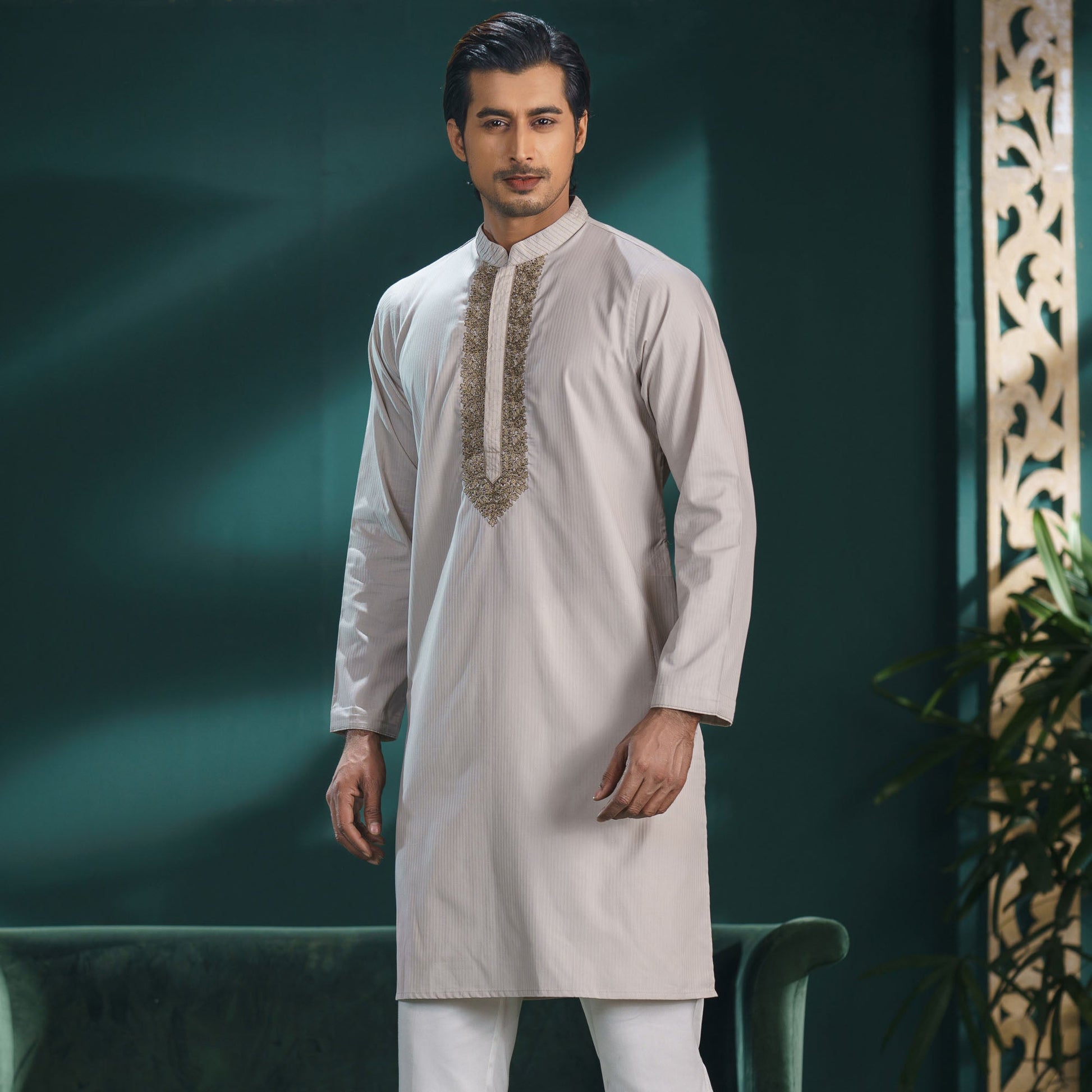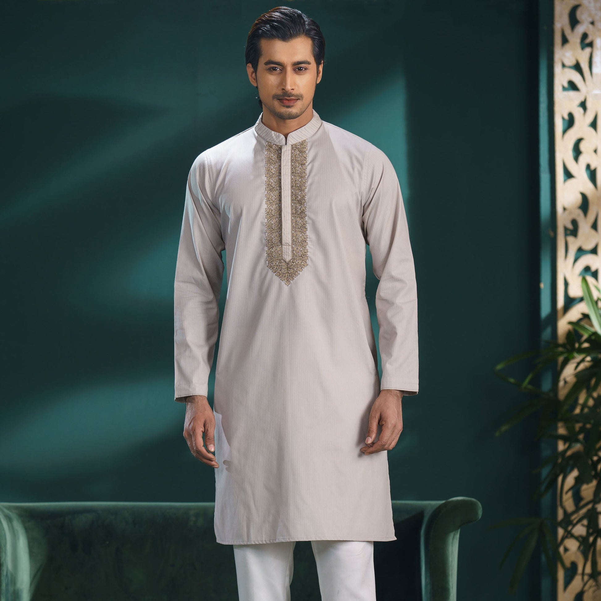 This Men's Grey-Beige Embroidered Panjabi is designed with a mandarin collar and detailed embroidery on soft cotton jacquard fabric. The regular fit ensures comfort and style, making it ideal for both festive and formal occasions. The unique grey-beige combination adds a refined and sophisticated touch.