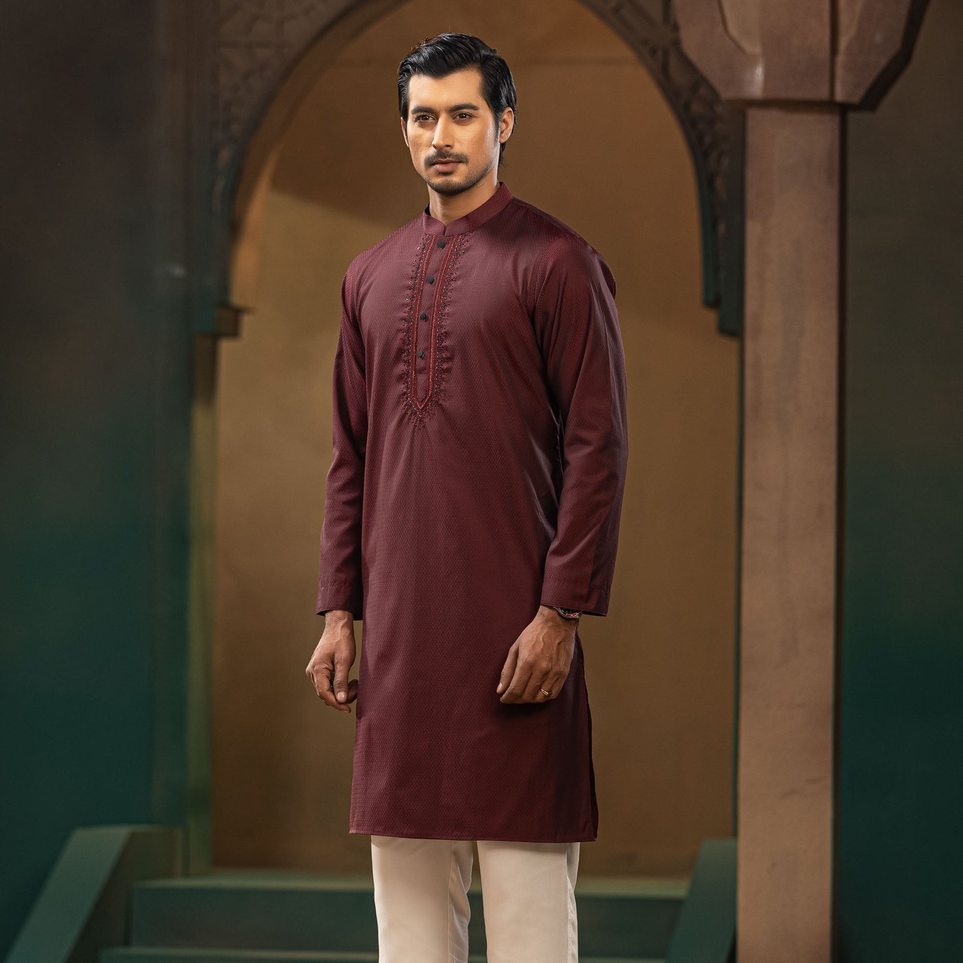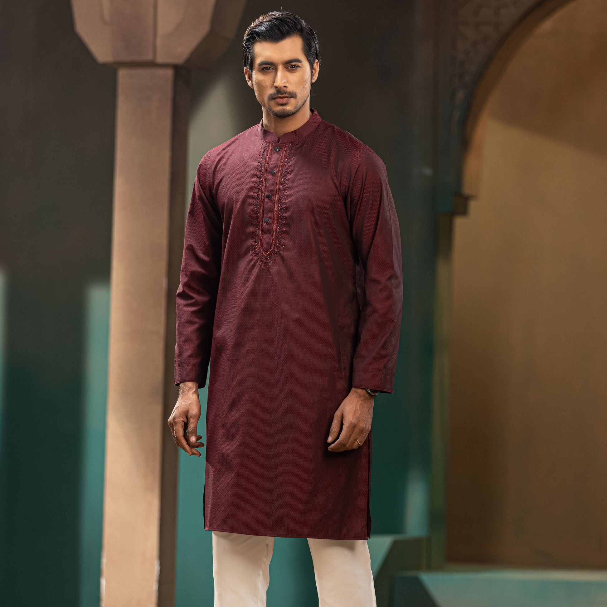 This men’s maroon karchupi Panjabi features a mandarin collar with zardozi embroidery and metal shank buttons, providing a touch of elegance. Made from poly cotton, it offers a regular fit and is available in panjabi size, perfect for traditional and festive occasions.