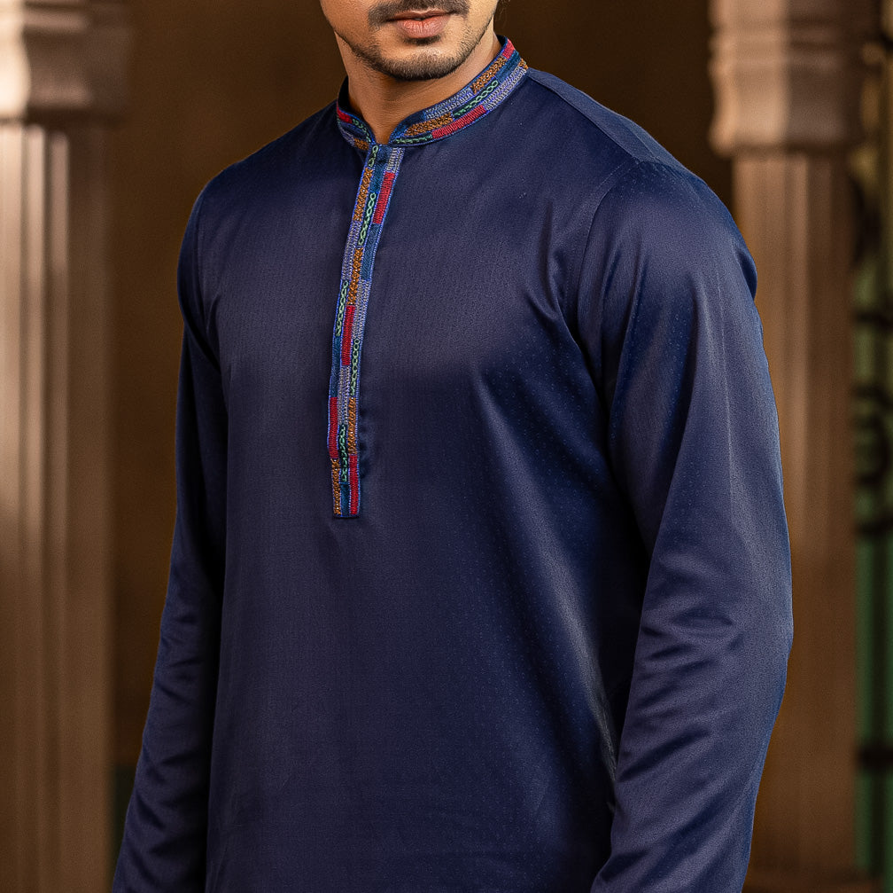 This men’s dark navy karchupi Panjabi is adorned with zardozi embroidery and features a mandarin collar with metal shank buttons. Made from poly cotton, it offers a regular fit, blending elegance and comfort for traditional and festive occasions.
