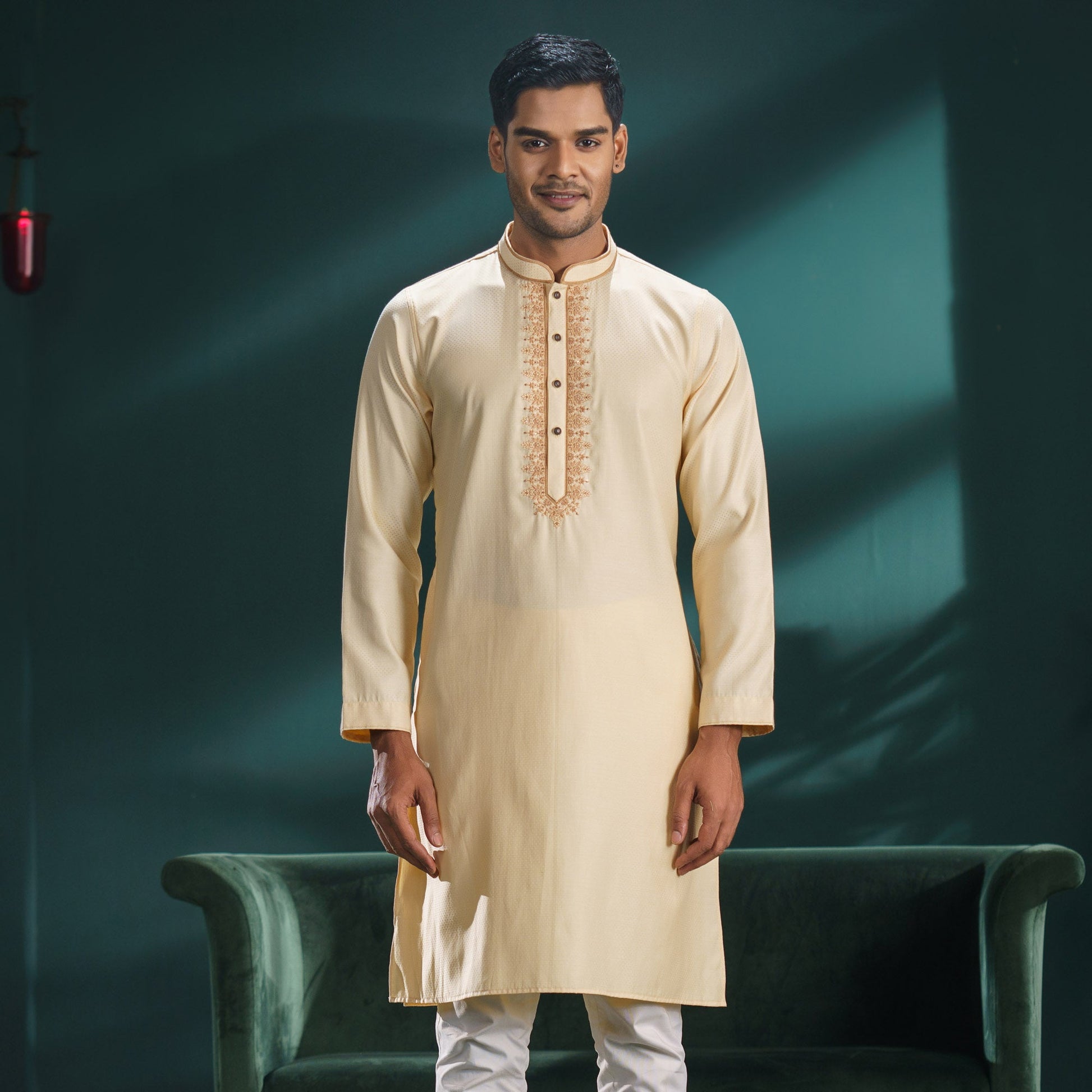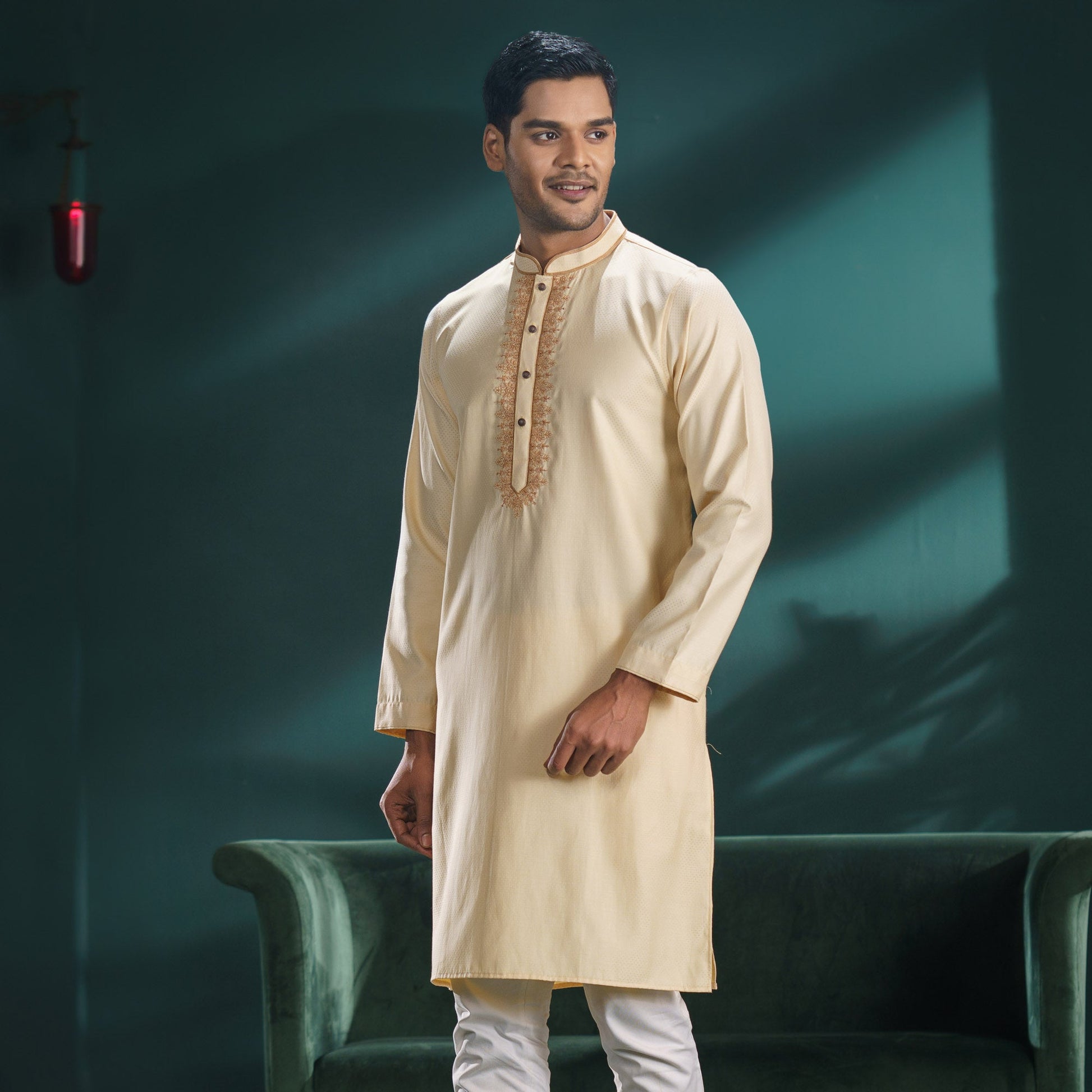 This men’s beige karchupi Panjabi features a mandarin collar with zardozi embroidery and metal shank buttons for a touch of sophistication. Crafted from poly cotton, it offers a regular fit and is available in Panjabi size, perfect for traditional and festive events.