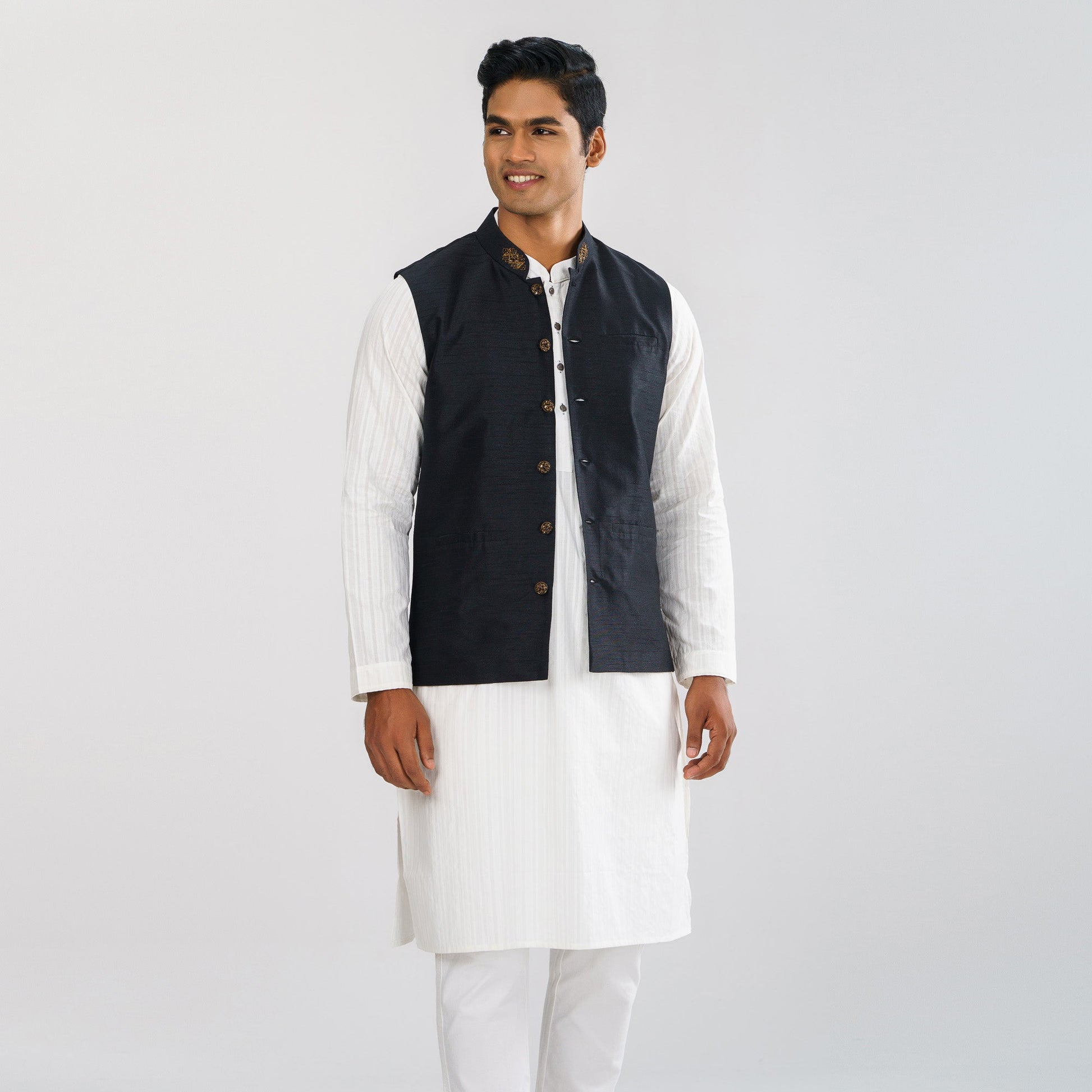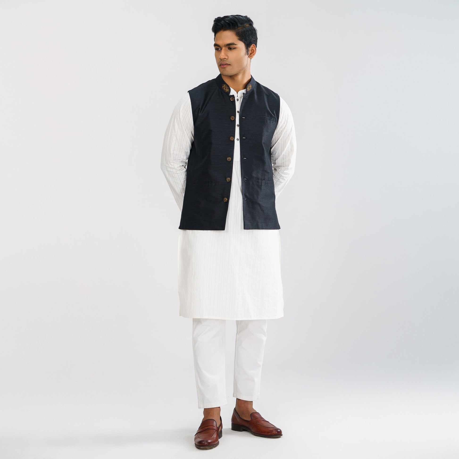 This elegant black vest features intricate karchupi work, showcasing traditional craftsmanship. Made from premium tasshor silk, it offers a regular fit, perfect for formal occasions or cultural events. Ensure longevity with dry cleaning for maintenance.