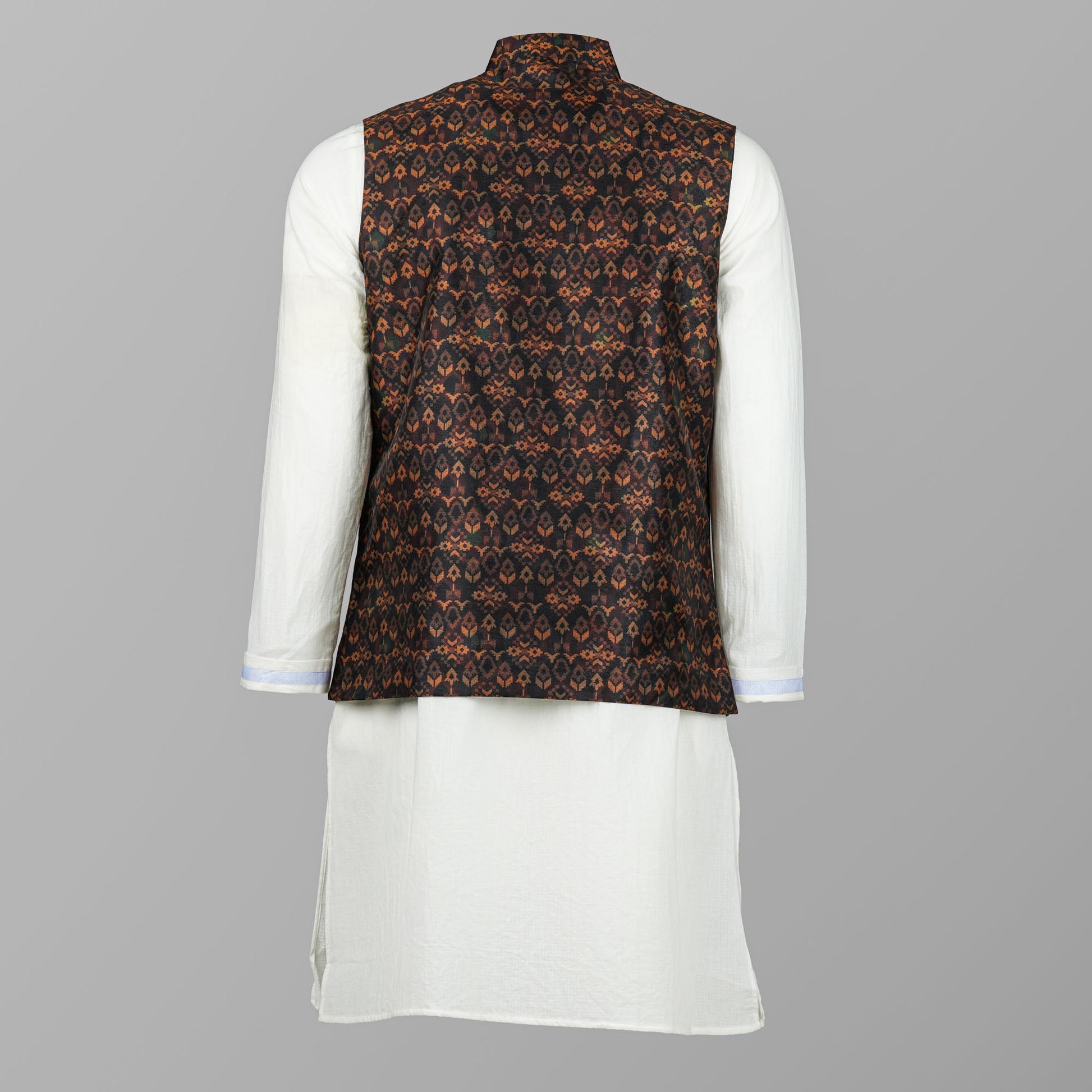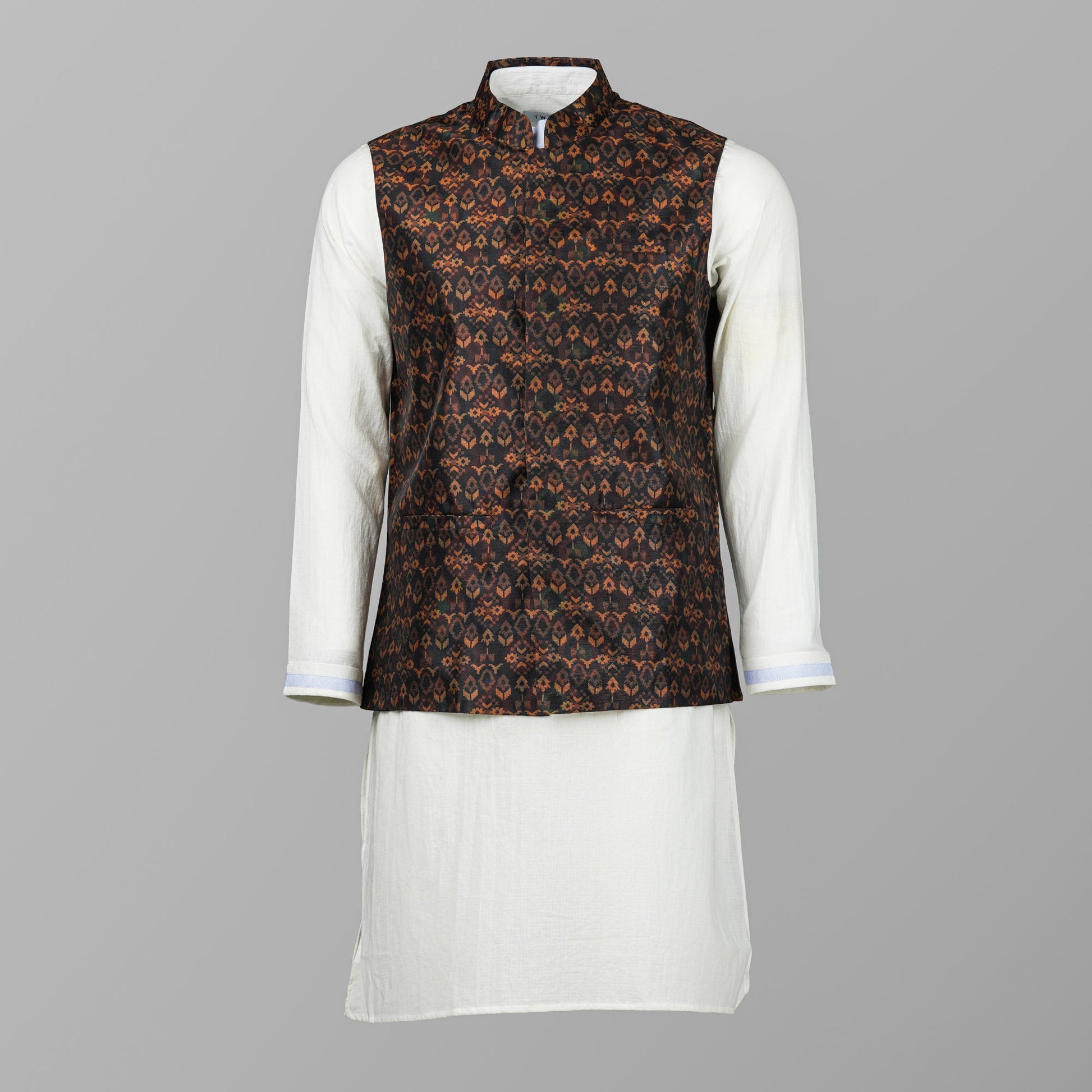 Elegant men’s vest in black, crafted from premium jacquard fabric for a rich and textured finish. Designed with a smart tailored fit, it combines comfort with a sophisticated look. Perfect for pairing with kurtas or panjabis, making it an ideal choice for weddings, festive occasions, or formal gatherings.