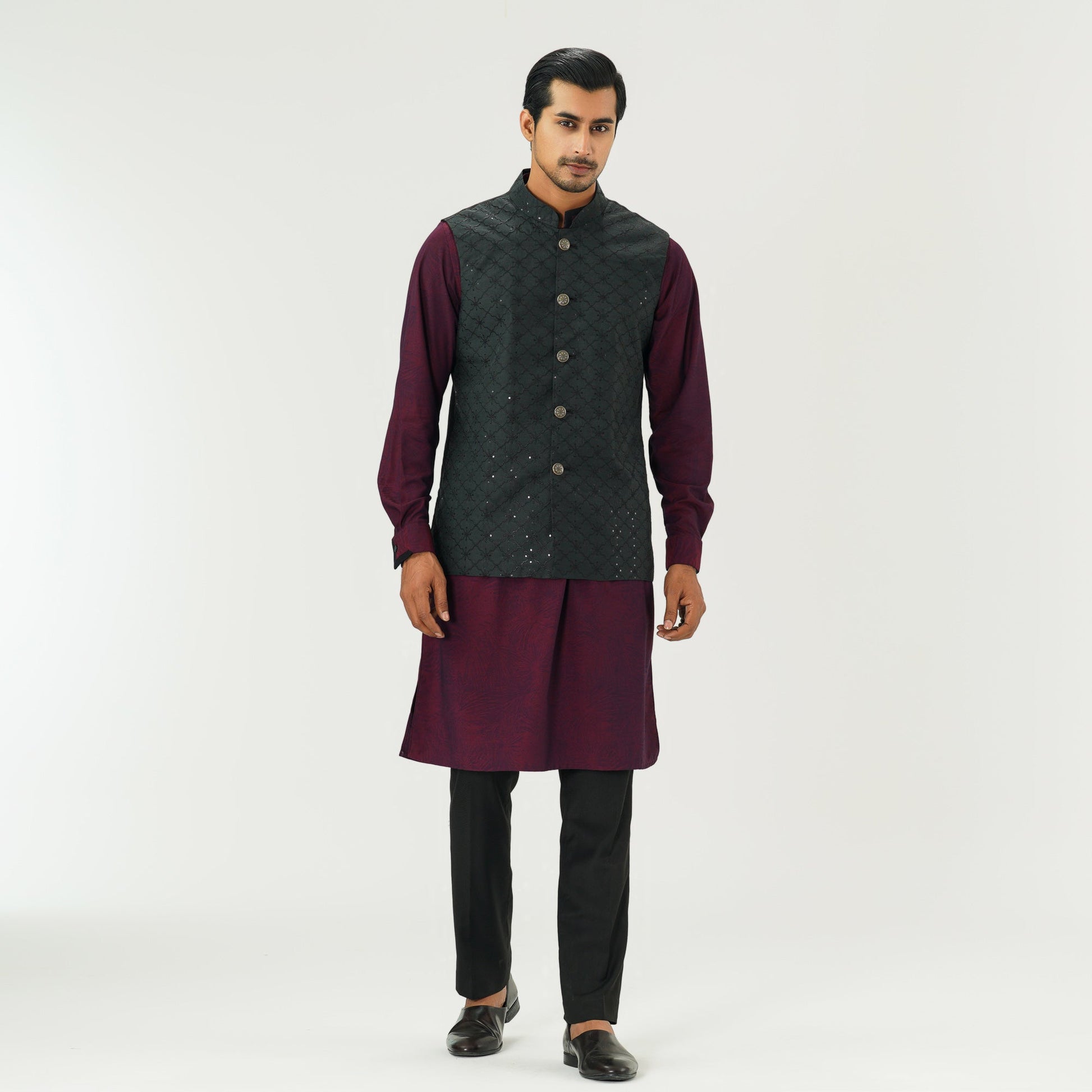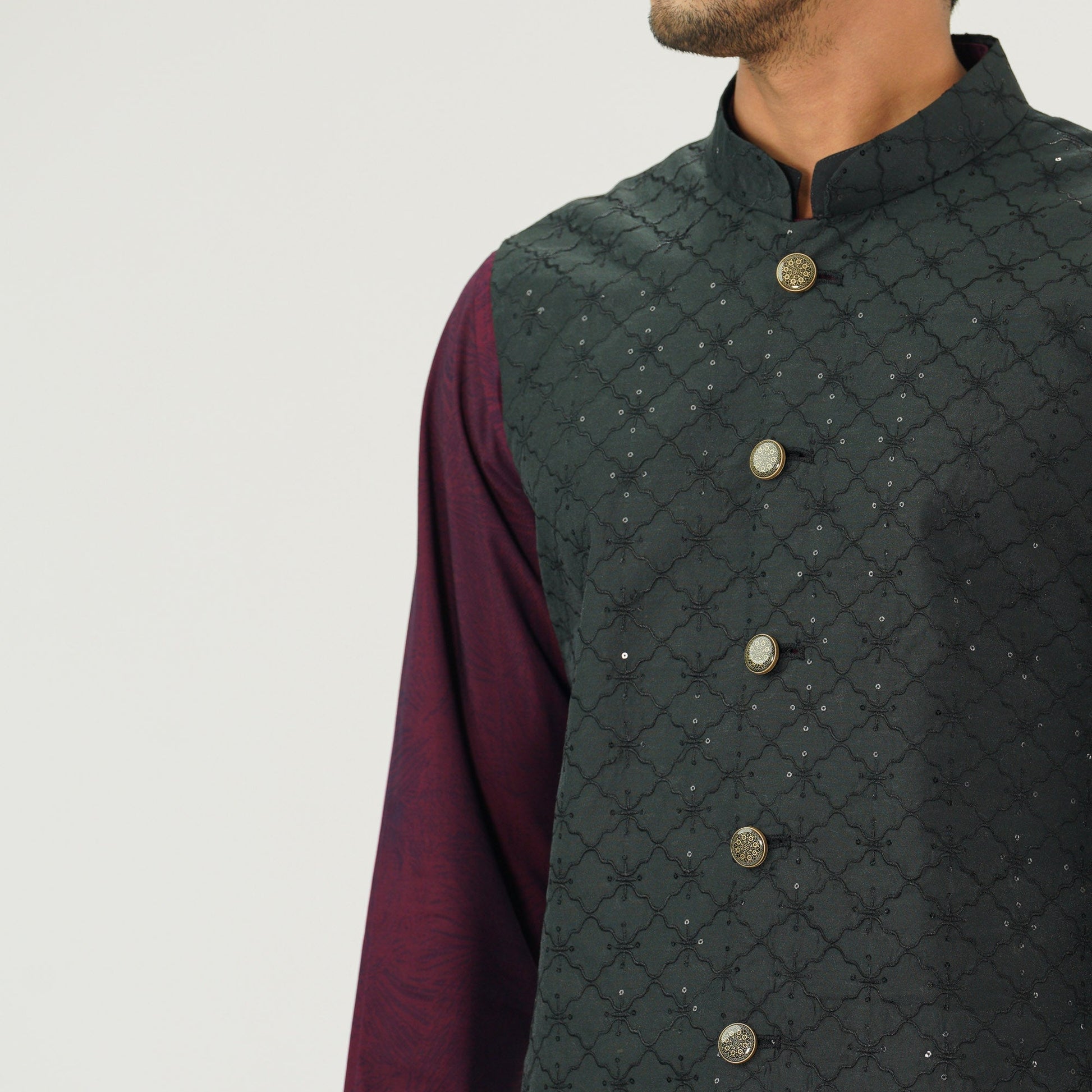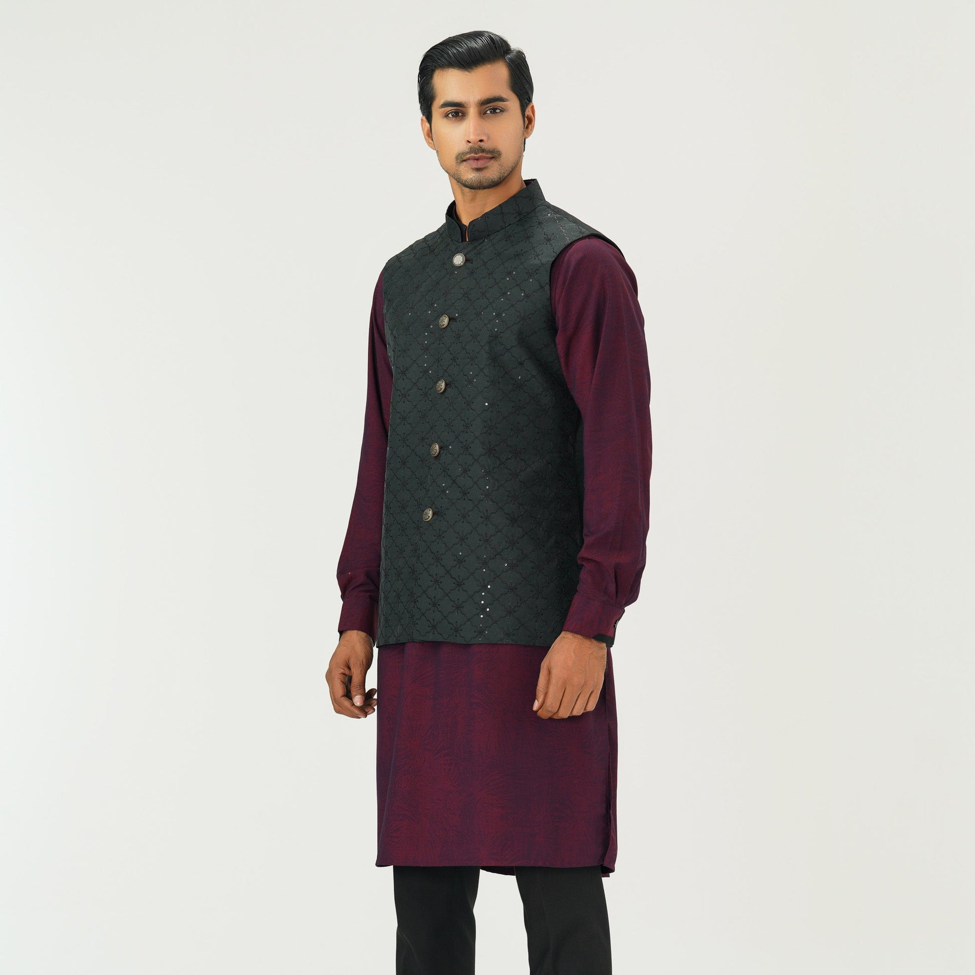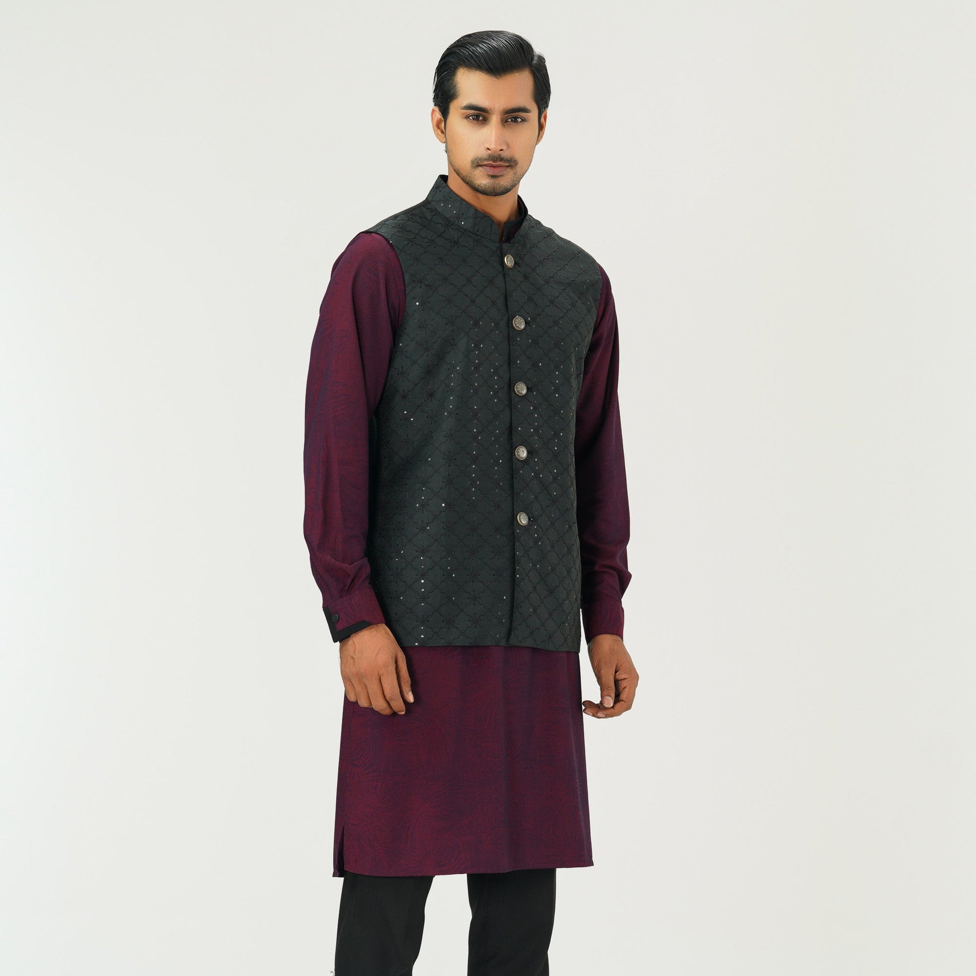 This black vest for men is crafted from tissue fabric with all-over sequin embroidery, enhanced with DTM thread and sequin detailing. Designed with elegant karchupi work, it blends traditional craftsmanship with modern sophistication perfect for festive occasions or stylish layering.