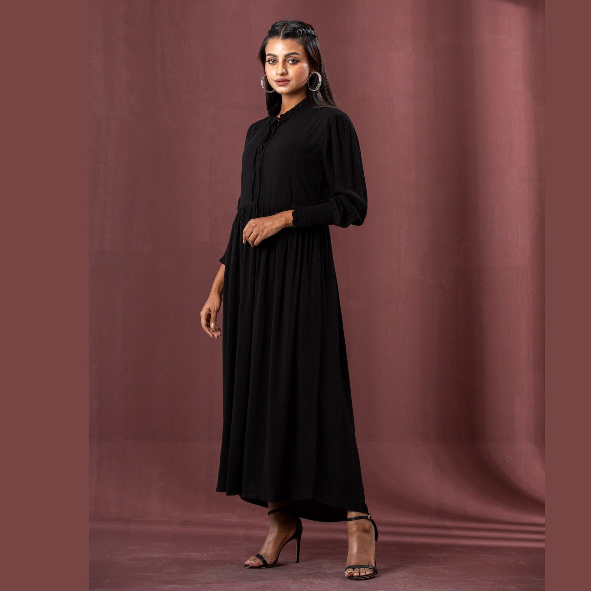This ladies' black long dress features a frilled neckline, smocked sleeves, and a gathered waist, creating a chic and flattering silhouette. Made from lightweight georgette fabric, it offers a regular fit that blends elegance with comfort, ideal for any occasion.