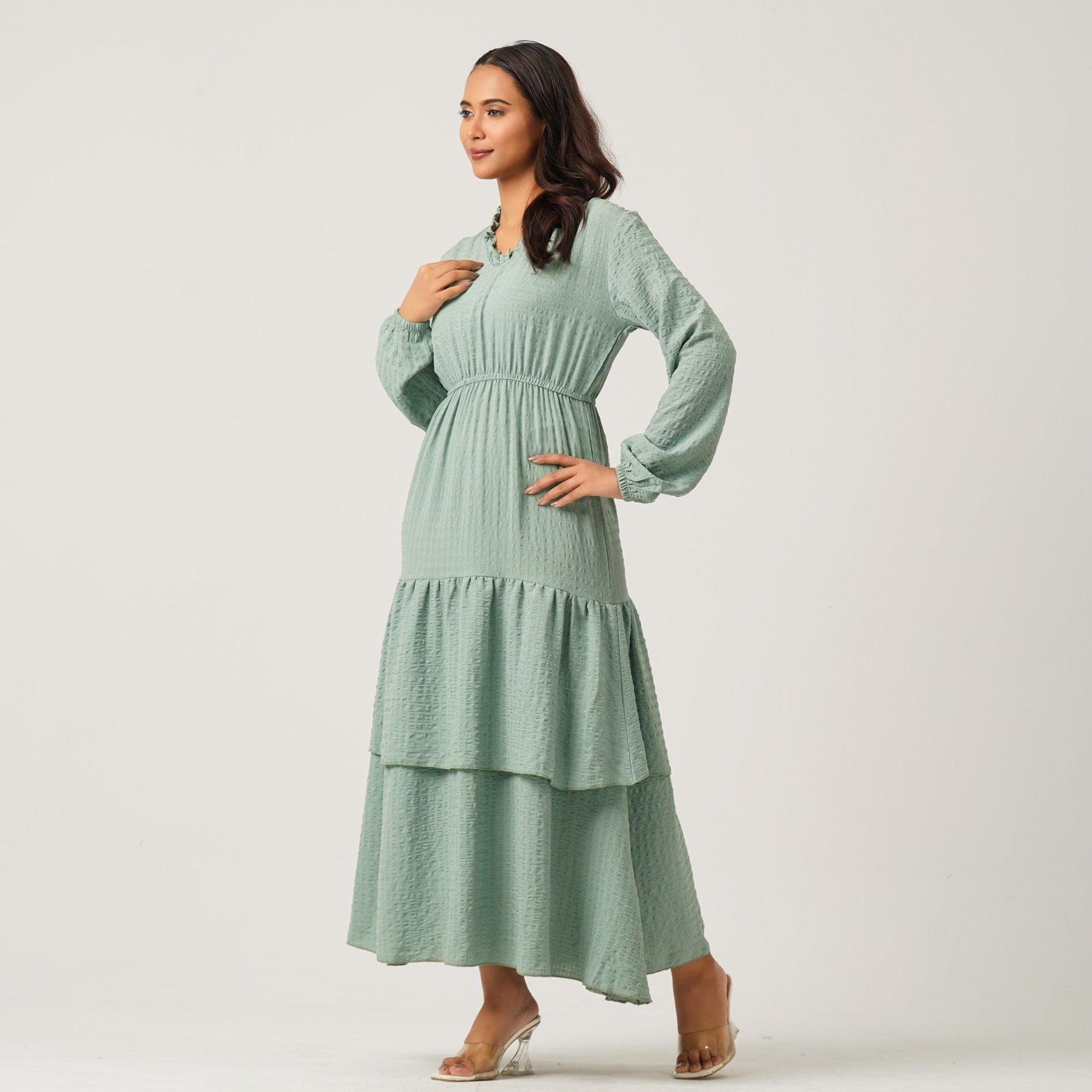 Graceful ladies gown crafted from soft blended fabric in a refreshing light green shade. Designed for comfort and elegance, making it ideal for festive gatherings or special occasions.