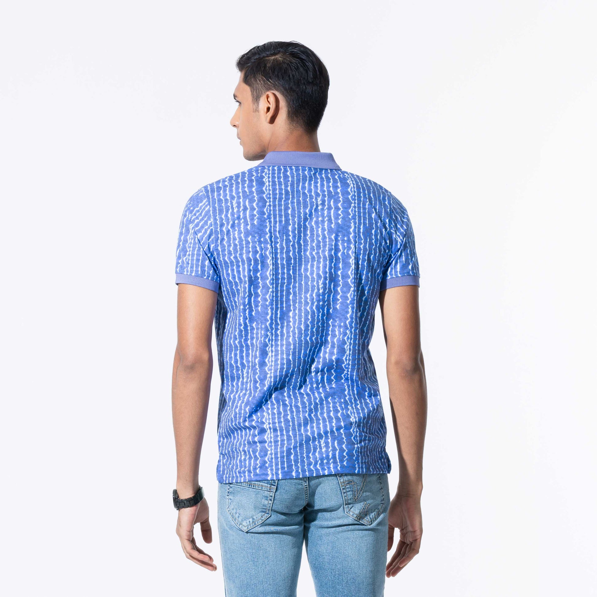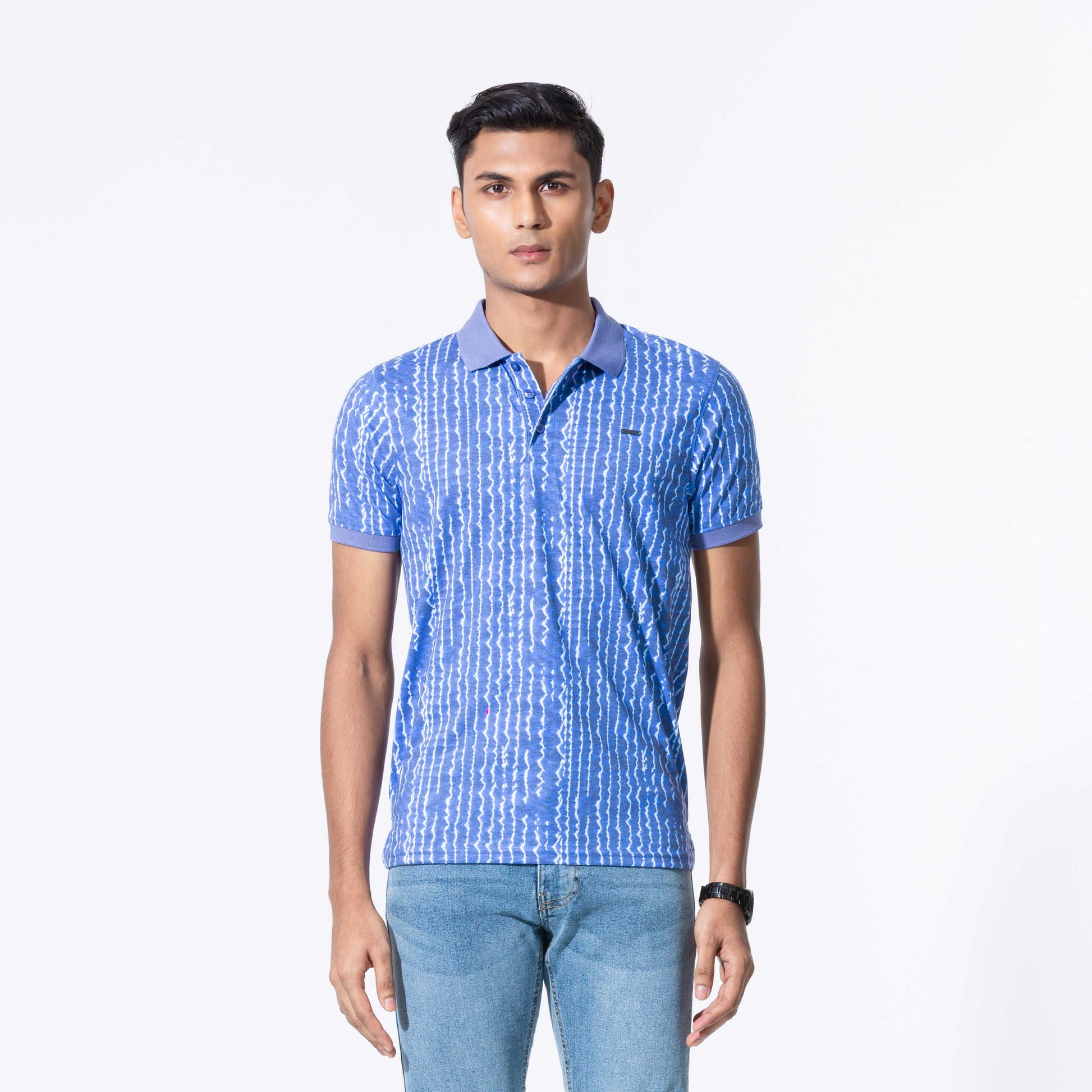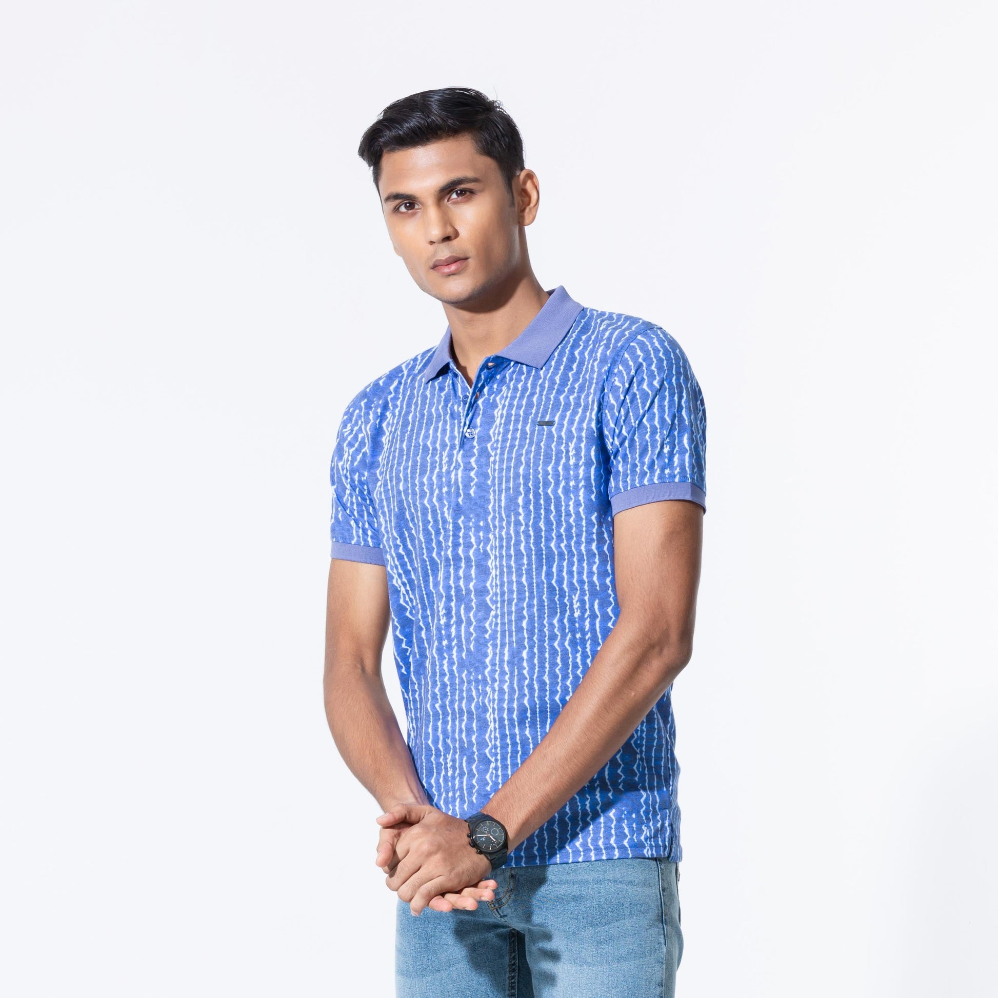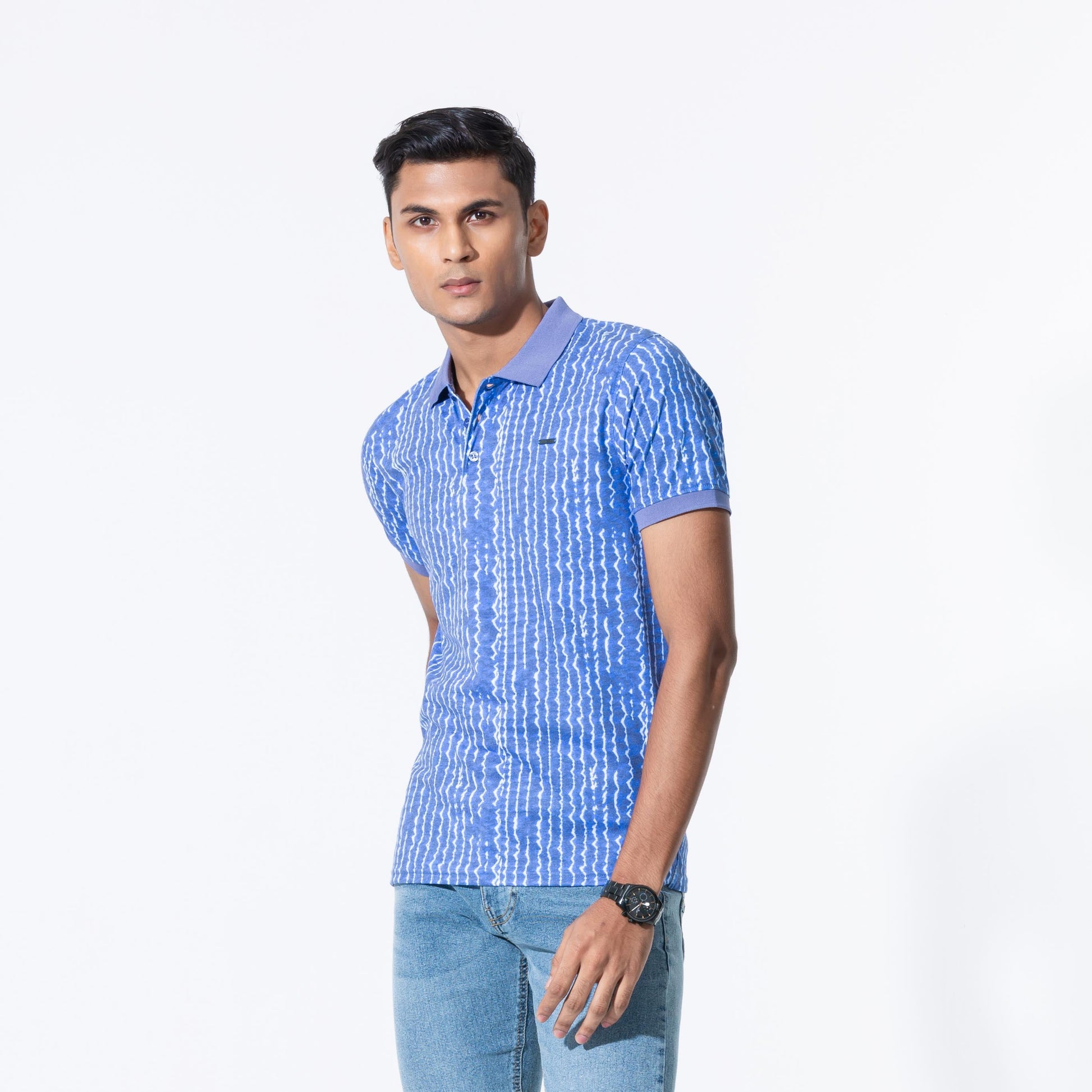 This navy polo shirt features an all-over print (AOP) and a metal badge on the chest, offering a modern and stylish look. Made from a CVC 60/40 blend, it ensures a soft, comfortable feel with durability. Perfect for casual wear, it combines comfort and style effortlessly.