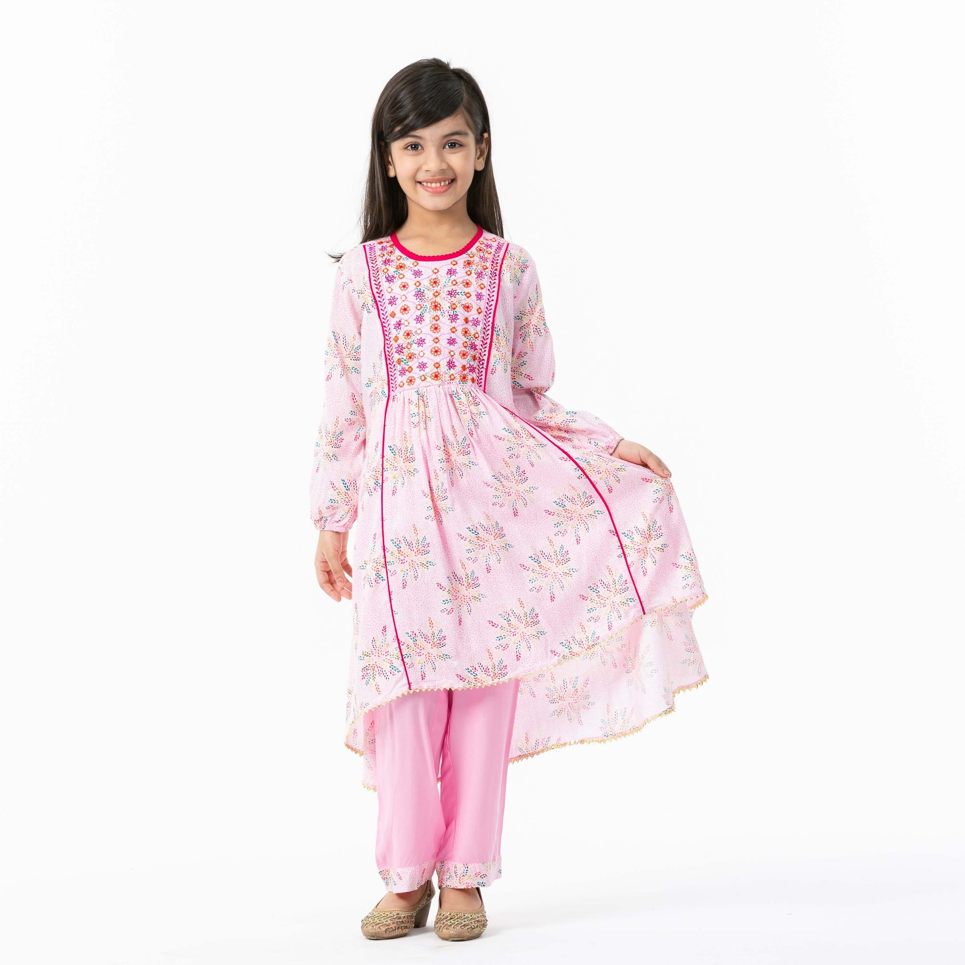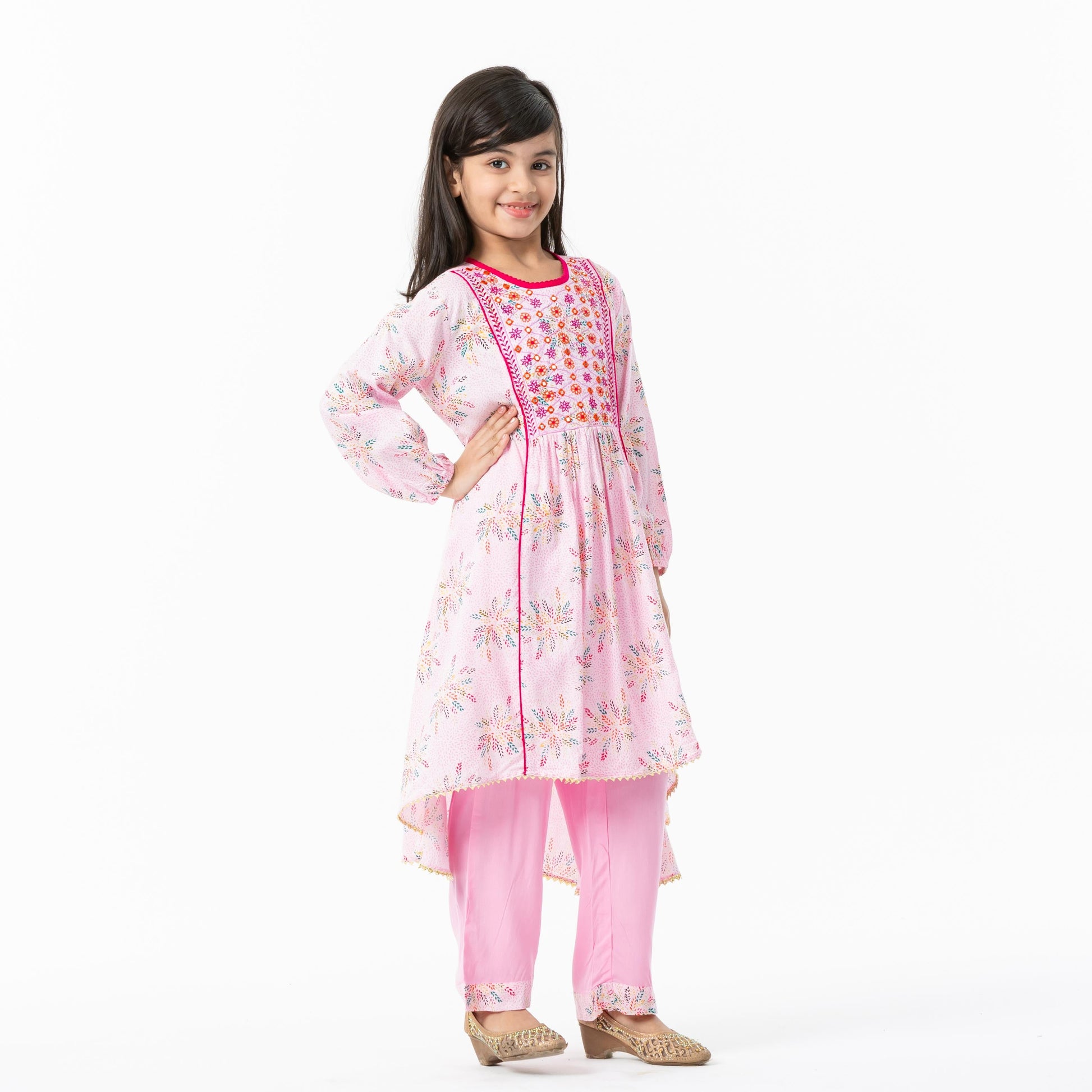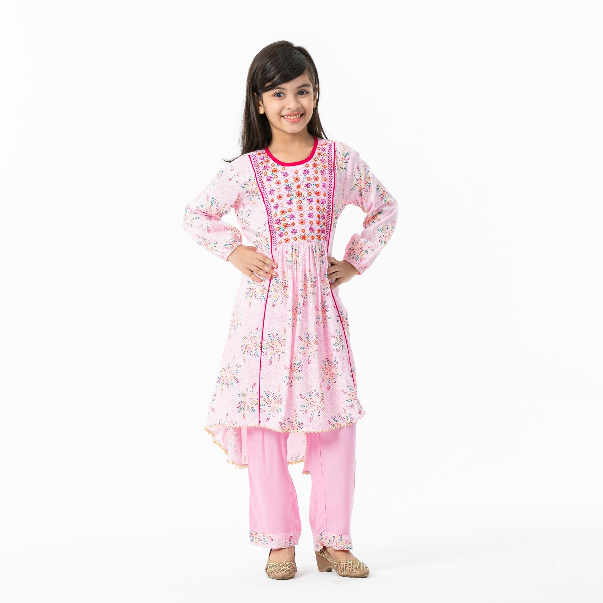 This girls' 2-piece ethnic set in pink features a beautiful print with half embroidery details. Crafted from soft linen fabric, it offers a comfortable and regular fit, making it perfect for traditional and festive occasions.