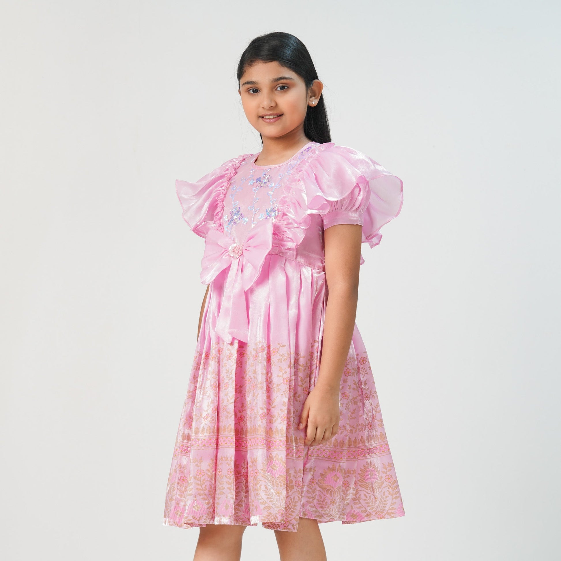 This elegant pink frock is crafted from shimmery tissue fabric, adding a touch of sparkle to any occasion. Featuring a delicate placement screen print, decorative net fabric, and a charming bow detail, it’s perfect for any celebrations.