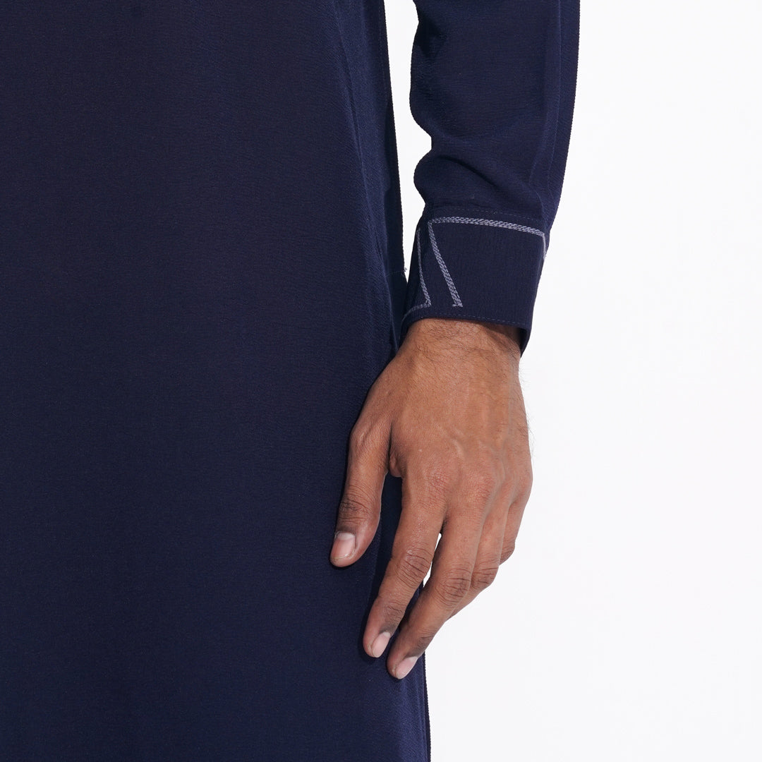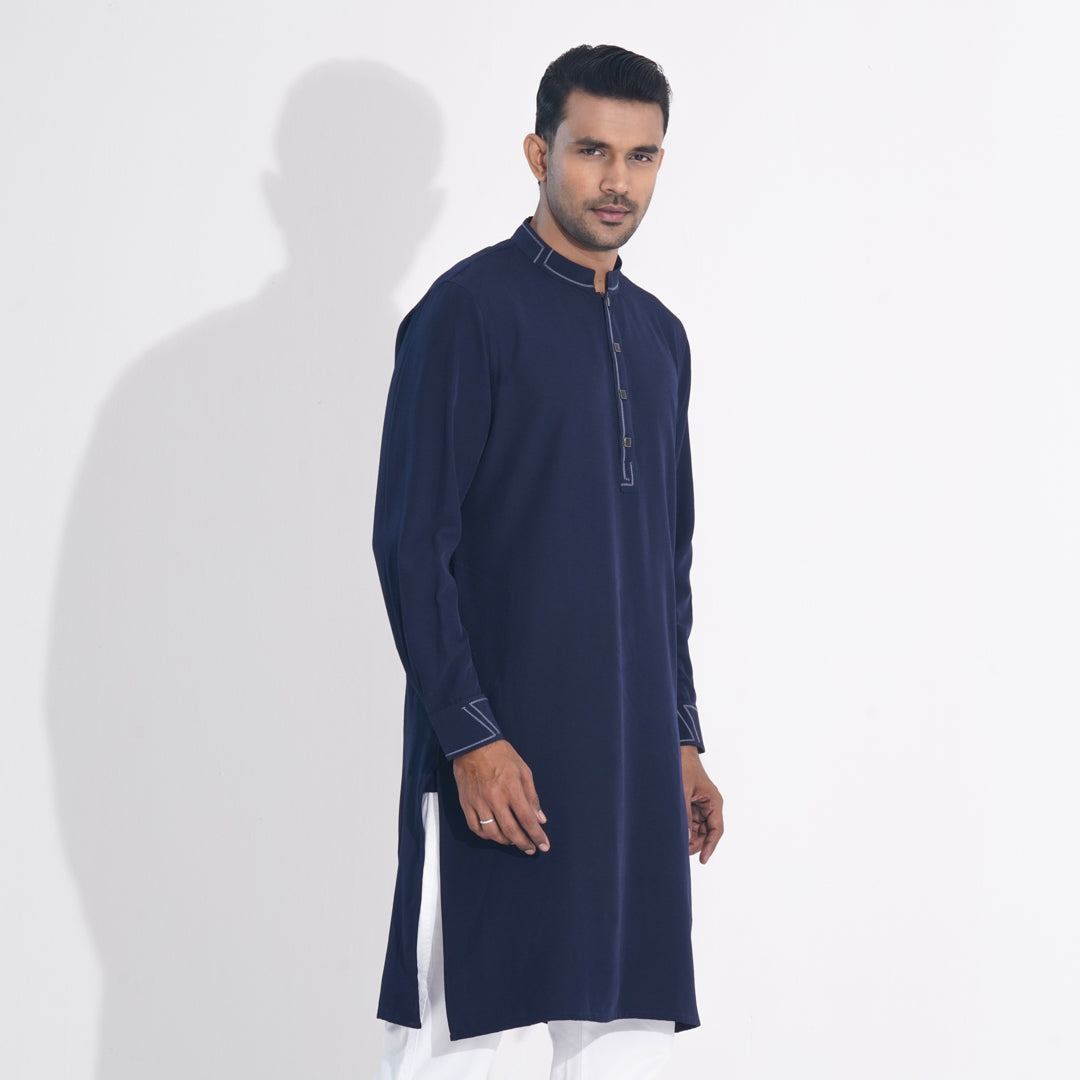 This blue men's Panjabi features a sleek solid design with refined run stitch detailing for a sophisticated touch. Made from high-quality blended fabric, it offers a slim fit for a polished look. Perfect for festive occasions or cultural gatherings, this Panjabi blends elegance with everyday comfort.