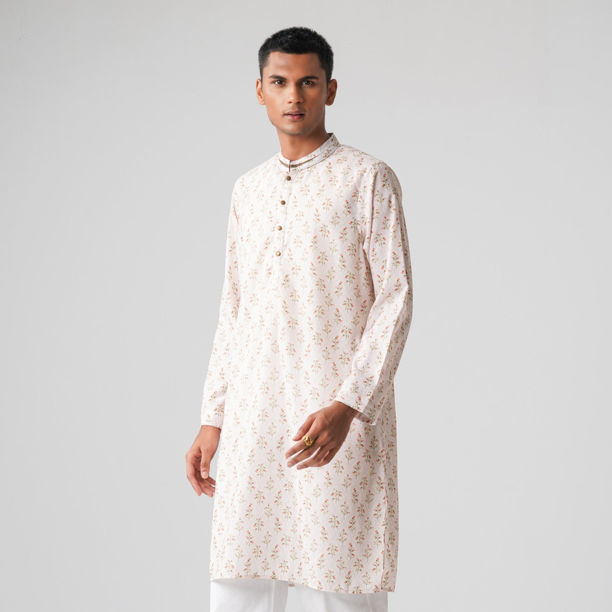 Classic mens basic panjabi in off white, crafted from comfortable mixed cotton fabric. Designed with a subtle flower-based digital print, it features solid detailing and cut & sew work on the collar. A stylish yet traditional choice for any occasion.
