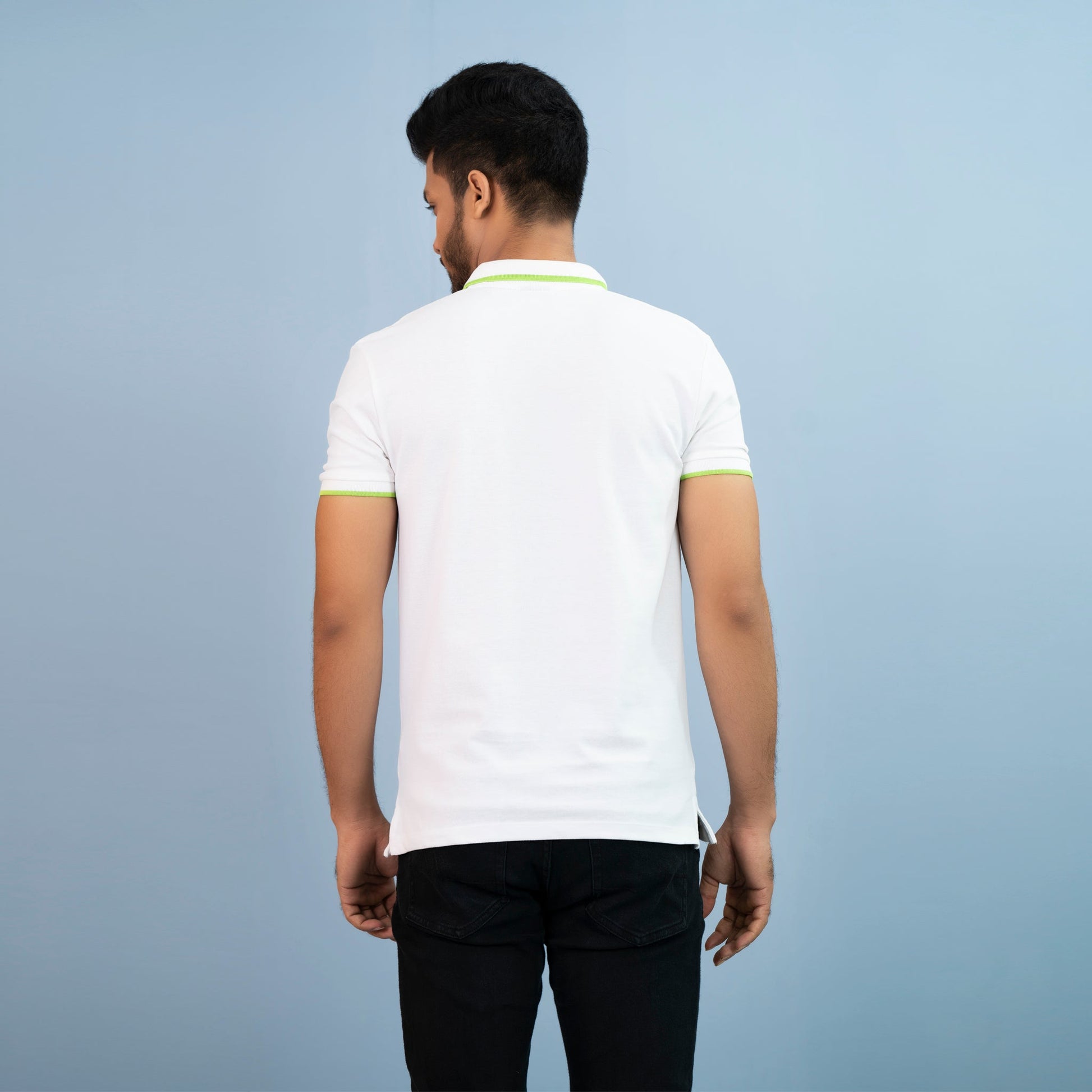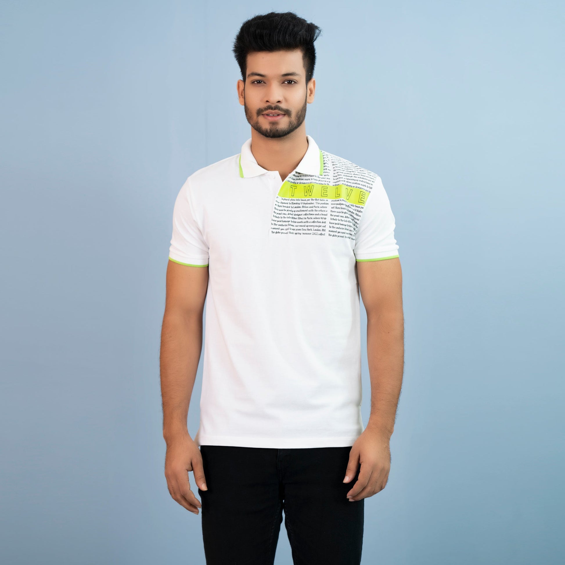 This men's white polo features a distinctive placement print and contrast tipping for a modern touch. Crafted from 100% cotton pique, it provides a slim fit and exceptional comfort. Ideal for elevating your casual or semi-formal outfits.